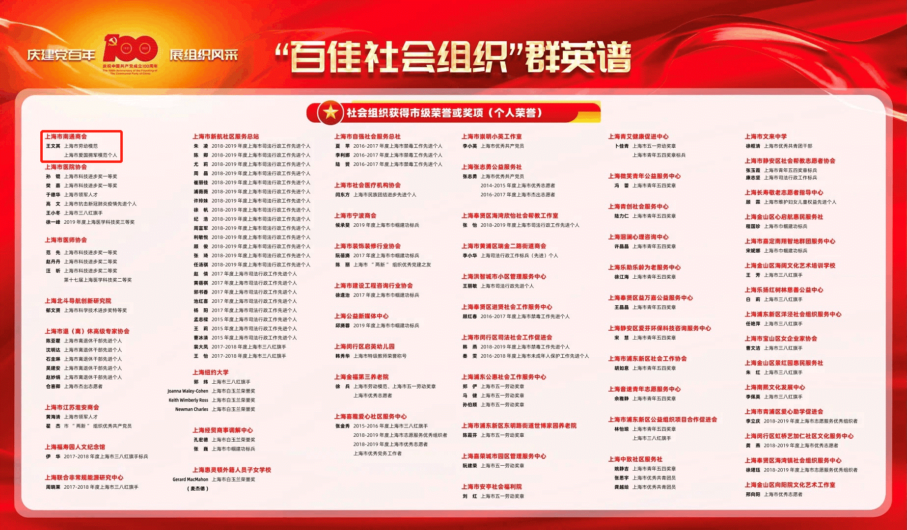 黨的百年奮進(jìn)的進(jìn)程中,各級(jí)社會(huì)組織的默默耕耘必然有著濃墨重彩的筆劃。慶祝中國(guó)共產(chǎn)黨建黨百年之際,董事長(zhǎng)王文其掌舵的上海市南通商會(huì)及其本人榮登上海市“百佳社會(huì)組織”群英譜,位列榜首!